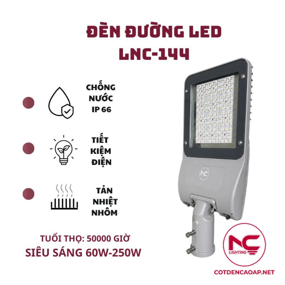 Đèn LED đường phố LNC-144 phù hợp với nhiều không gian ngoài trời nhờ thiết kế đèn đường phổ biến, dễ kết hợp với tay cần và cột đèn chiếu sáng. Khi bố trí đúng phương án kỹ thuật, sản phẩm có thể hỗ trợ nâng cao khả năng quan sát vào ban đêm, góp phần tăng độ an toàn cho khu vực lưu thông và không gian công cộng.