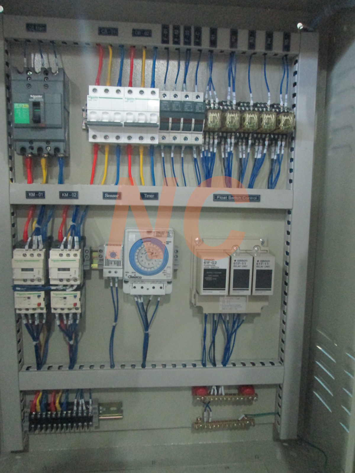 - Cấu tạo tủ điều khiển chiếu sáng gồm có ổn áp. át tổng , 2 khởi động từ, 2 rơ le thời gian, 6 át một pha và các phụ kiện đi kèm được đấu nối với nhau theo dúng sơ đồ nguyên lý hoạt động đảm bảo tính thẫm mỹ và an toàn trong quá trình sử dụng